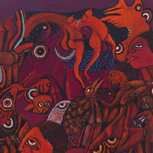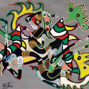 et des motifs dynamiques, évoquent des scènes oniriques où le sacré et le